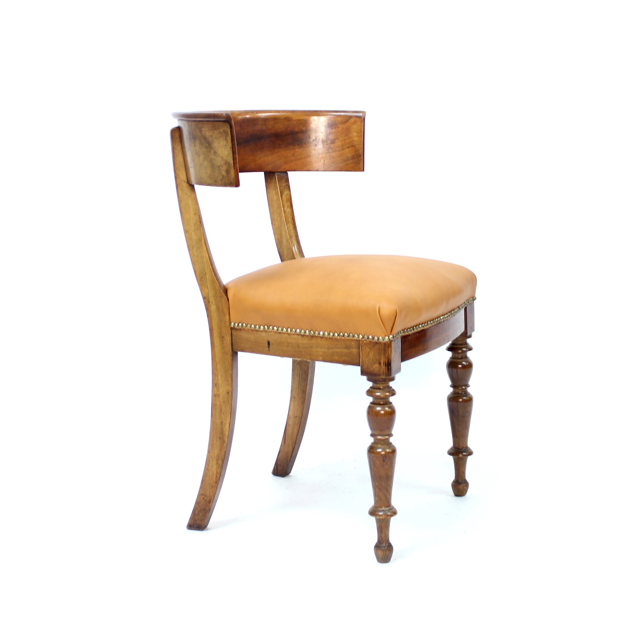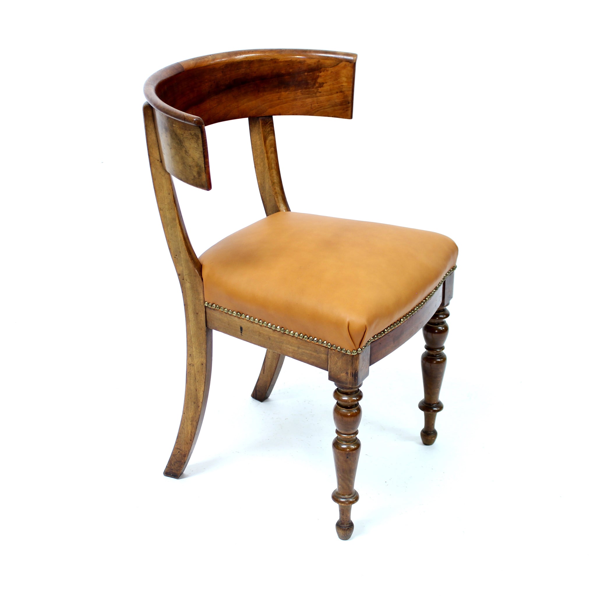 Mahogany Klismos chair with light brown leather seat made in the early part of the 20th century. The vintage leather is newly upholstered. This piece is most likely Scandinavian and made in Sweden. The klismos chair originated in ancient Greece, perfected by the 5th century BCE and is defined by its curved, splayed legs and a concave backrest. After falling out of fashion, its design was resurrected during the Neoclassical revival in the 18th century thanks to discoveries in Pompeii and Herculaneum. The model was redefined the late 19th century and during the early and mmid 20th century by designers like Samuel Gragg, T.H Robsjohn-Gibbings and Josef Frank. This example is in a good vintage condition with light ware consistent with age and use.