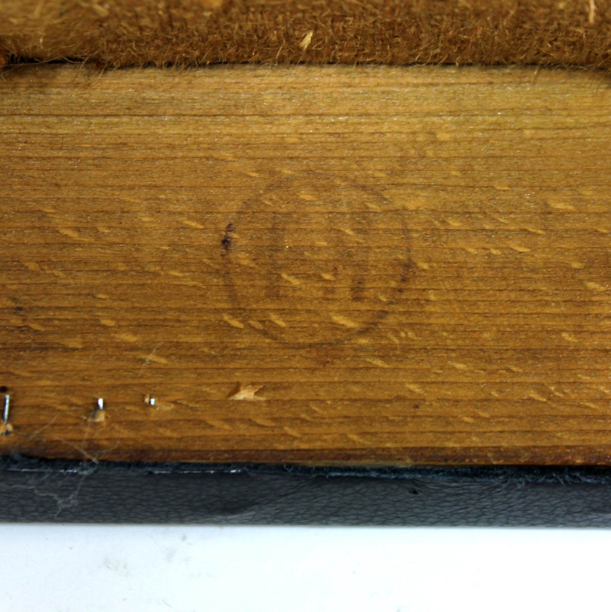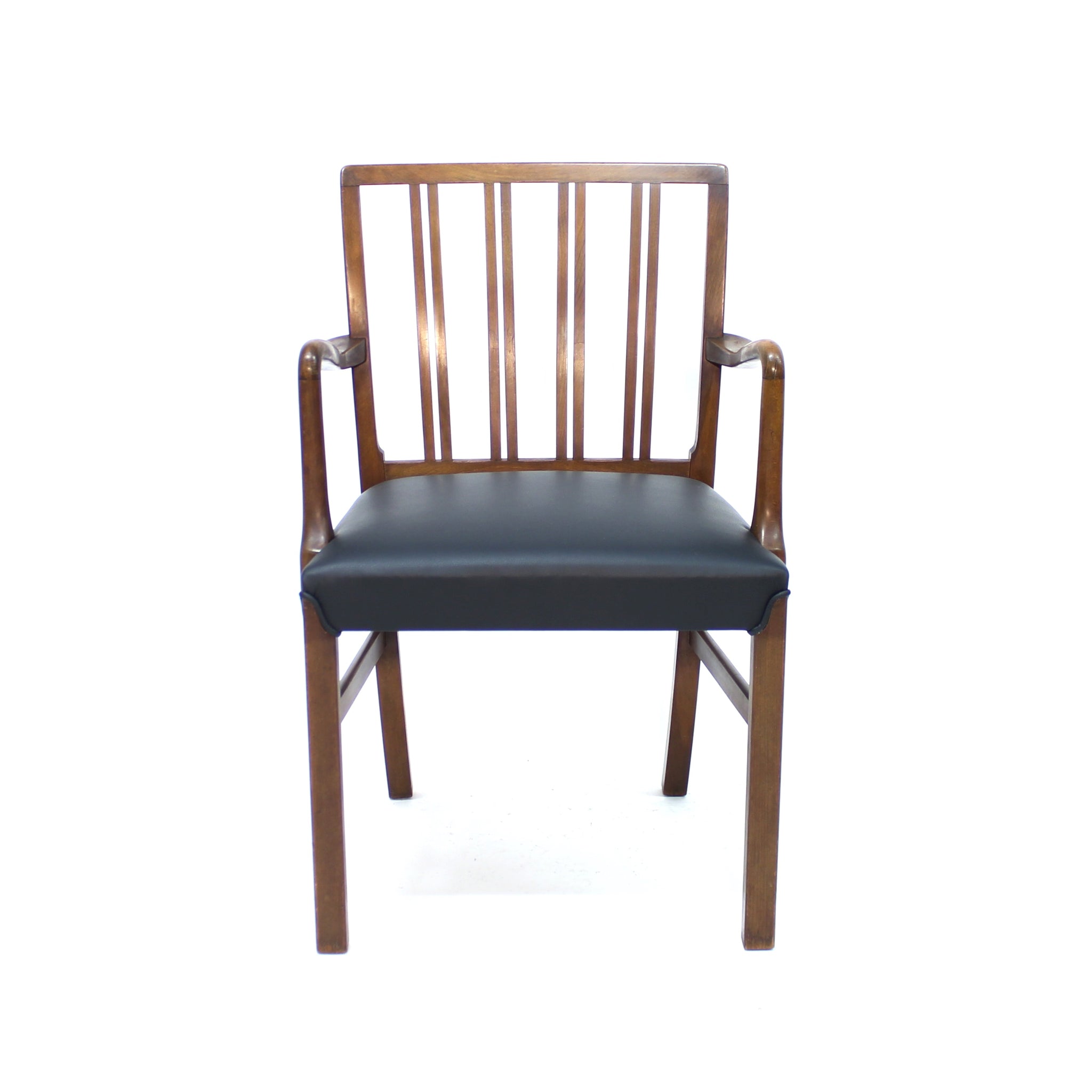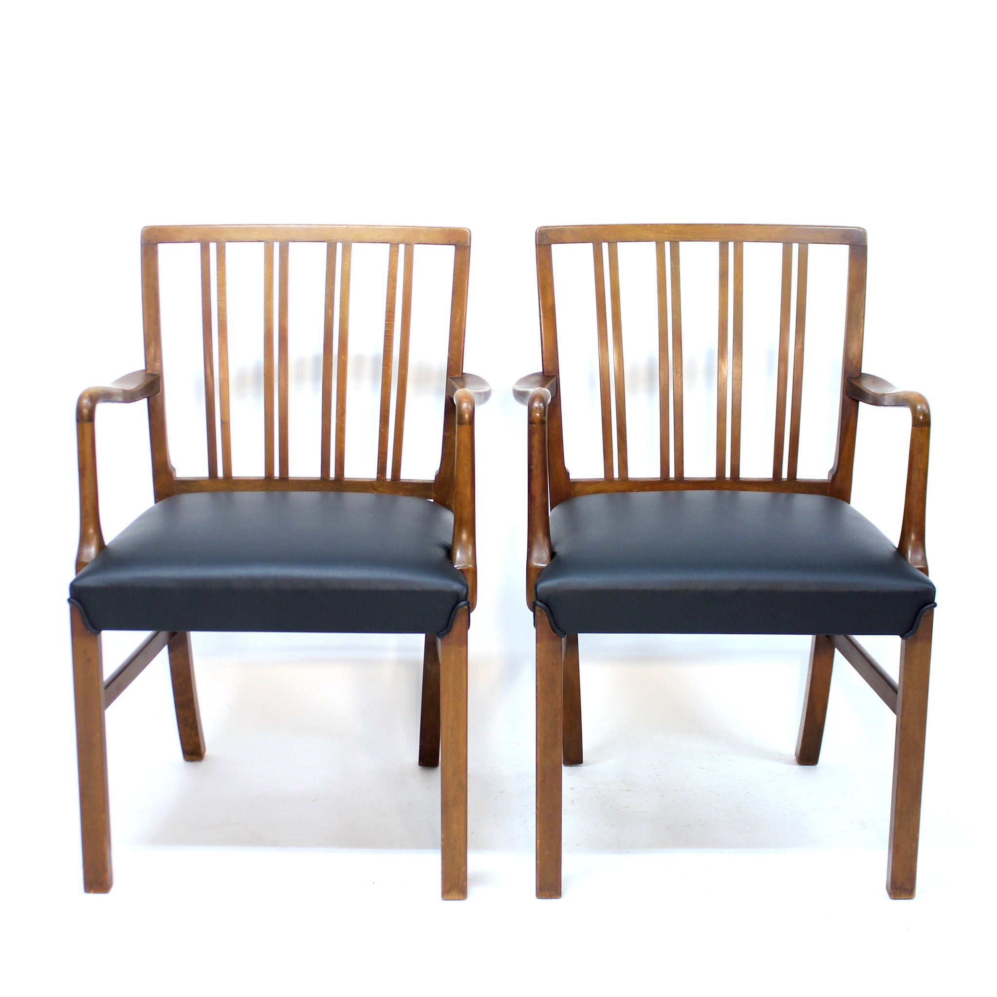 1940s lounge chairs in stained Beech, model 1675, designed by Ole Wanscher for Fritz Hansen. Because of the stain they has a very Mahogany look. This pair was made in 1942, so quite early in Wanschers career. New black leather upholstery of fine quality. Marked with paper label and stamped by maker. Good vintage condition with light ware consistent with age and use