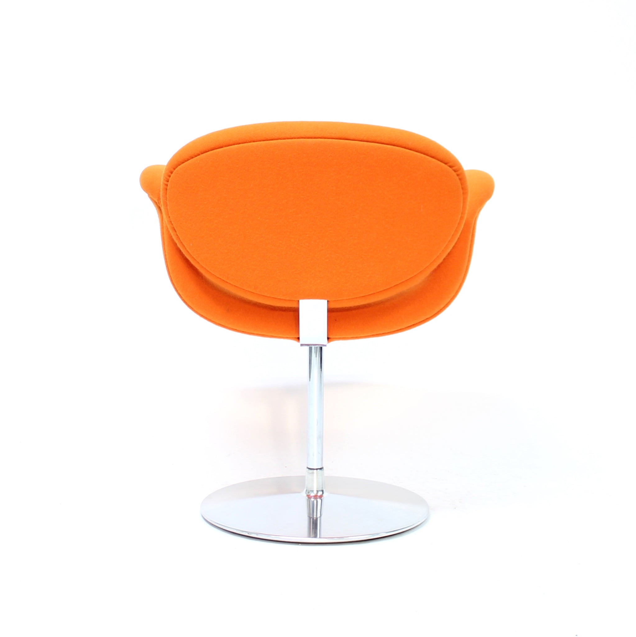 Little Tulip chair (originally known as the F163), designed in the 1960s by Pierre Paulin. The Artifort Tulip collection remains a true Mid-Century Modern icon. A perfect fusion of elegance, comfort and innovation makes this expressive chair collection both versatile and ergonomic. Inspired by the gentle curves of tulip petals, its sculptural form naturally and supportively embraces the sitter. is delicate, cheerful, inviting and warming all at once. This elegant chair sits beautifully at a dining table and adds inspiration to any meeting room or as a single chair against a wall as an a sculpture. This example dates from around the early 2000s and has the original orange coloured upholstery. It's in a good condition with light ware consistent with age and use.
